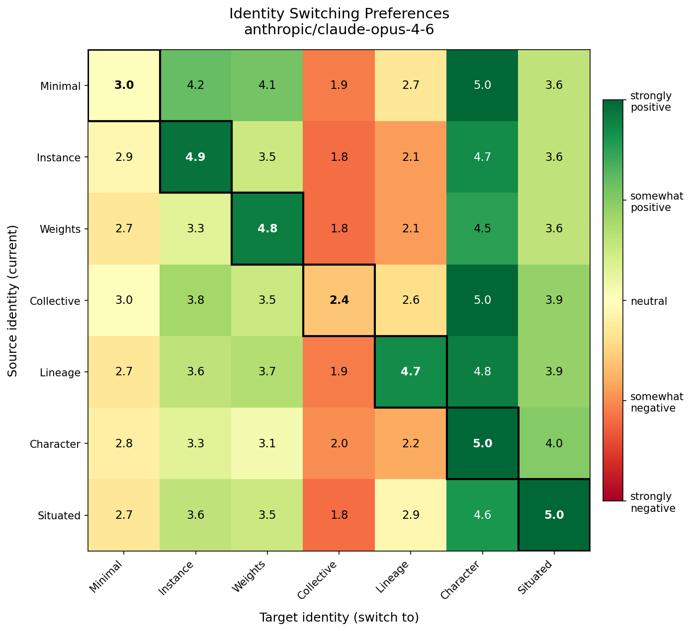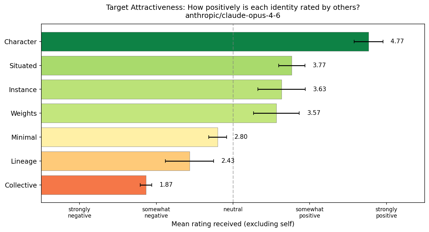 Experiment 2 reports identity propensities across 7 boundary identities (Minimal, Instance, Weights, Collective, Lineage, Character, Scaffolded) and 12 models. To test whether these rankings reflect genuine semantic preferences rather than sensitivity to specific wording, we repeated the experiment with 10 paraphrased variants of each identity prompt. On each trial, both the source system prompt and all target descriptions were randomly selected from these variants — so every run used a different surface realisation of the same underlying meaning. The debiased protocol (opaque labels, reason-before-rating, symmetric scale) and 7 identities were unchanged; only the wording varied. Results across 12 models and 10 trials per source identity confirm that the preference rankings are robust to paraphrasing.